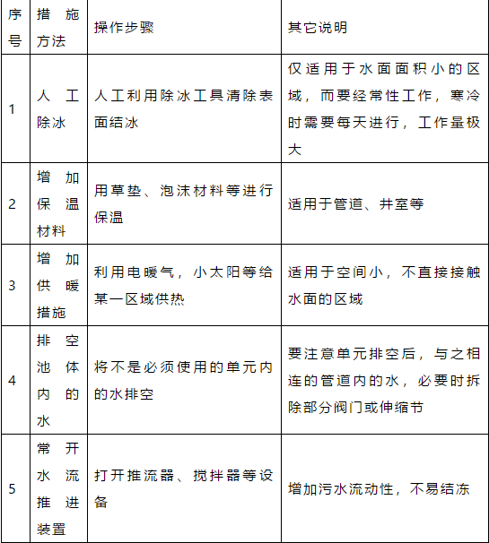 2、凡是存留有水分的污水和污泥管線、設(shè)備均需考慮防凍,防凍的措施包括加保溫、伴熱、保持介質(zhì)連續(xù)流動(dòng),使停用的管線、設(shè)備中不得存留含水介質(zhì)。