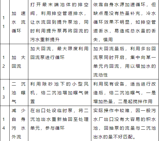 1、環(huán)境溫度降低至零度以下,厭氧、好氧系統(tǒng)的溫度可能會(huì)相應(yīng)降低,但對(duì)系統(tǒng)的處理能力影響有限。若確實(shí)有影響,對(duì)于厭氧系統(tǒng),可以通過(guò)提高進(jìn)水水溫的方法來(lái)解決(但是,厭氧反應(yīng)器的最高溫度不宜超過(guò)38.5℃),對(duì)于好氧系統(tǒng),可以通過(guò)稍稍提高污泥濃度,或者提高溶解氧的方式解決。