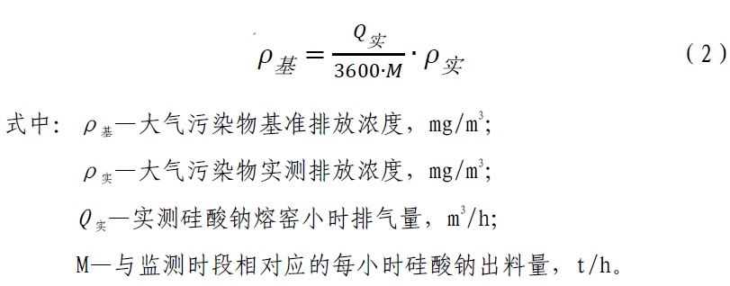 六、增加4.2.8 條,內(nèi)容為:純氧燃燒硅酸鈉熔窯應(yīng)監(jiān)測排氣筒中大氣污染物排放濃度、排氣量及相應(yīng)時間內(nèi)的硅酸鈉出料量,按式(2)換算為基準排氣量(3600 m3/t 硅酸鈉)條件下的大氣污染物基準排放濃度,并以此作為達標判定依據(jù)。大氣污染物排放濃度、排氣量、產(chǎn)品產(chǎn)量的監(jiān)測、統(tǒng)計周期為1 h,可連續(xù)采樣或等時間間隔采樣獲得大氣污染物排放濃度和排氣量數(shù)據(jù),硅酸鈉出料量數(shù)據(jù)以企業(yè)統(tǒng)計報表為依據(jù)。