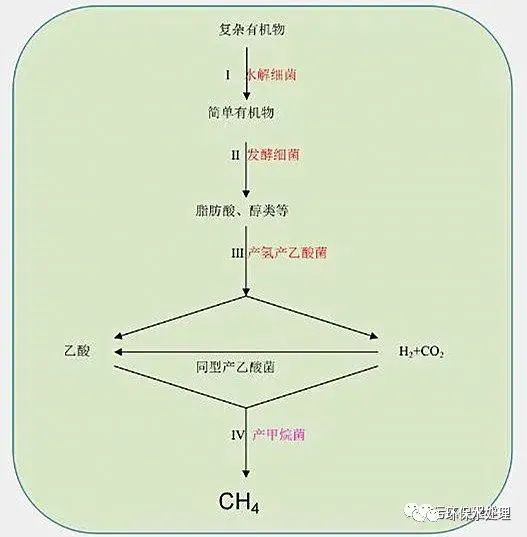 ④產甲烷階段——包括從乙酸形成甲烷,以及從氧、二氧化碳形成甲烷。